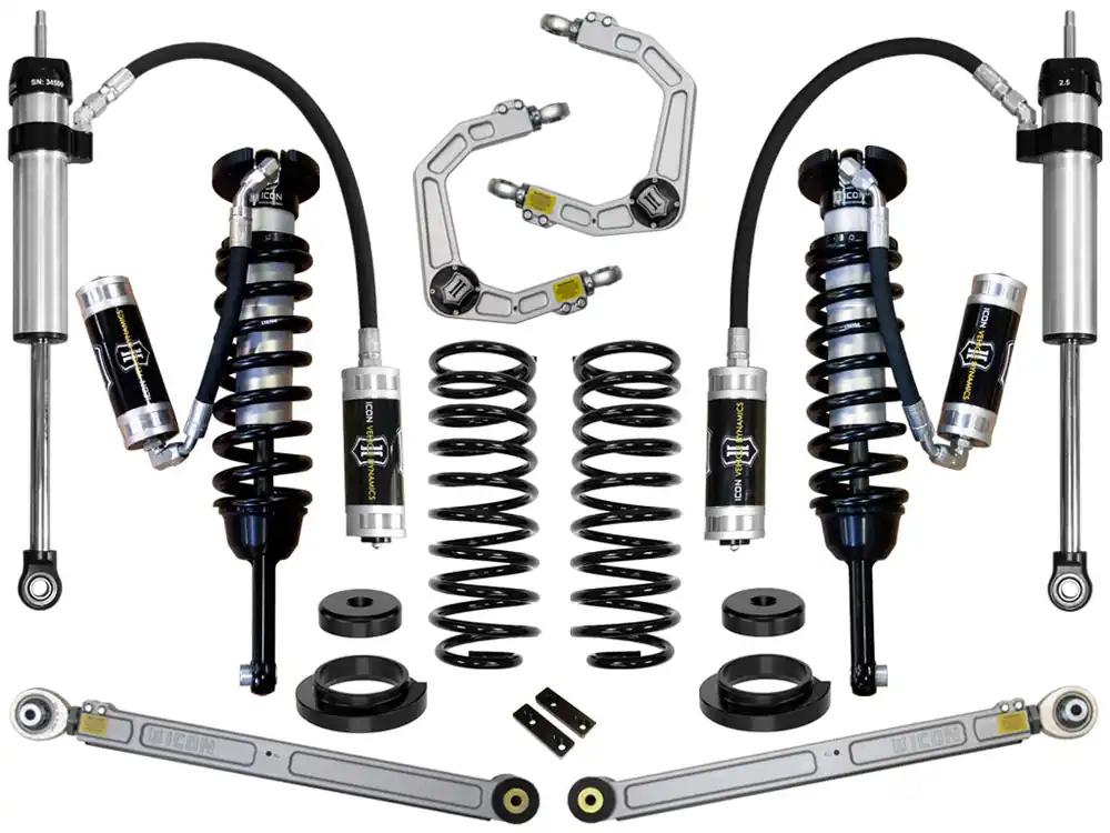 The Stage 5 system includes vehicle-specific tuned, extended travel 2.5” coilover shocks with remote reservoirs, for improved heat dissipation and off-road performance, paired with billet aluminum Delta Joint upper control arms. This combination allows for extended wheel travel and on-vehicle adjustment of the upper control arms to dial in front end alignment. The coilovers are also height adjustable from 0-3.5” of lift over stock, allowing the use of larger, more aggressive wheel and tire combinations. ICON 2” lift rear coil springs paired with 2.5 Aluminum Series remote reservoir rear shocks utilizing vehicle-specific valving balance the performance of the truck from front to rear. ICON’s billet aluminum lower links are much stronger than the OE units, improve articulation, and can be adjusted while installed on the vehicle for optimum pinion angle. On top of it all, these links have been designed to provide correct roll steer geometry for the best possible handling on and off-road. Specifically for the GX470 platforms a rear coil spring conversion kit is included to eliminate the factory rear air bags. The ICON Vehicle Dynamics 2003-2009 Lexus GX470 Stage 5 suspension system is an excellent choice for those drivers looking to enhance the capabilities of their pickup on the road as well as in the dirt.