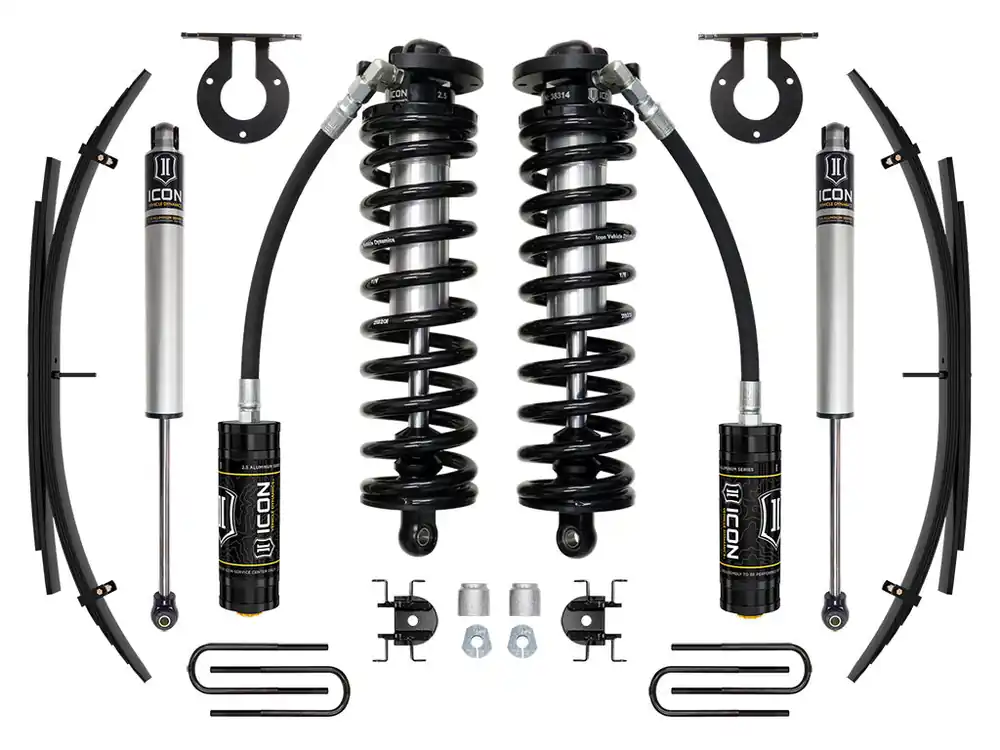 The ICON 2.5-3” coilover conversion suspension system is a great way to lift your 4WD 2011-2016 Ford F-250/F-350 Super Duty while improving ride quality and performance. This entry level system is great for towing, rough construction site terrains, and country dirt roads all while keeping a smooth highway feel. ICON’s Stage 1 System is comprised of 2.5 Series remote reservoir coilovers that are adjustable from 2.5-3” of front lift over stock, alignment cams for adding caster, rear leaf spring expansion packs with blocks and U-bolts for a more compliant ride and reduced axle wrap, and ICON 2.0 Aluminum Series internal reservoir rear shocks. With the endless hours ICON has spent testing and tuning our suspension components and shocks as a complete package, you can rest assured you have the best suspension solution on the market.