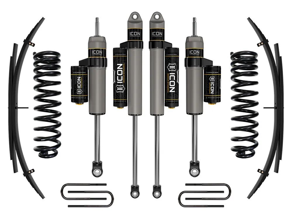 The ICON 2.5” suspension system is a great way to lift your 4WD 2011-2016 Ford F-250/F-350 Super Duty while improving ride quality and performance. This upgraded Stage 3 system is great for towing, rough construction site terrains, and country dirt roads all while keeping a smooth highway feel. ICON’s Stage 3 System is comprised of dual rate coil springs, 2.5 Aluminum Series piggyback reservoir front and rear shocks, alignment cams for adding caster, and rear leaf spring expansion packs with blocks and U-bolts for a more compliant ride and reduced axle wrap. ICON 2.5″ piggyback reservoir shocks ensure optimum performance by increasing the duration of consistent damping regardless of situation, keeping the shocks at a cooler operating temperature during heavy use. With the endless hours ICON has spent testing and tuning our suspension components and shocks as a complete package, you can rest assured you have the best suspension solution on the market.
