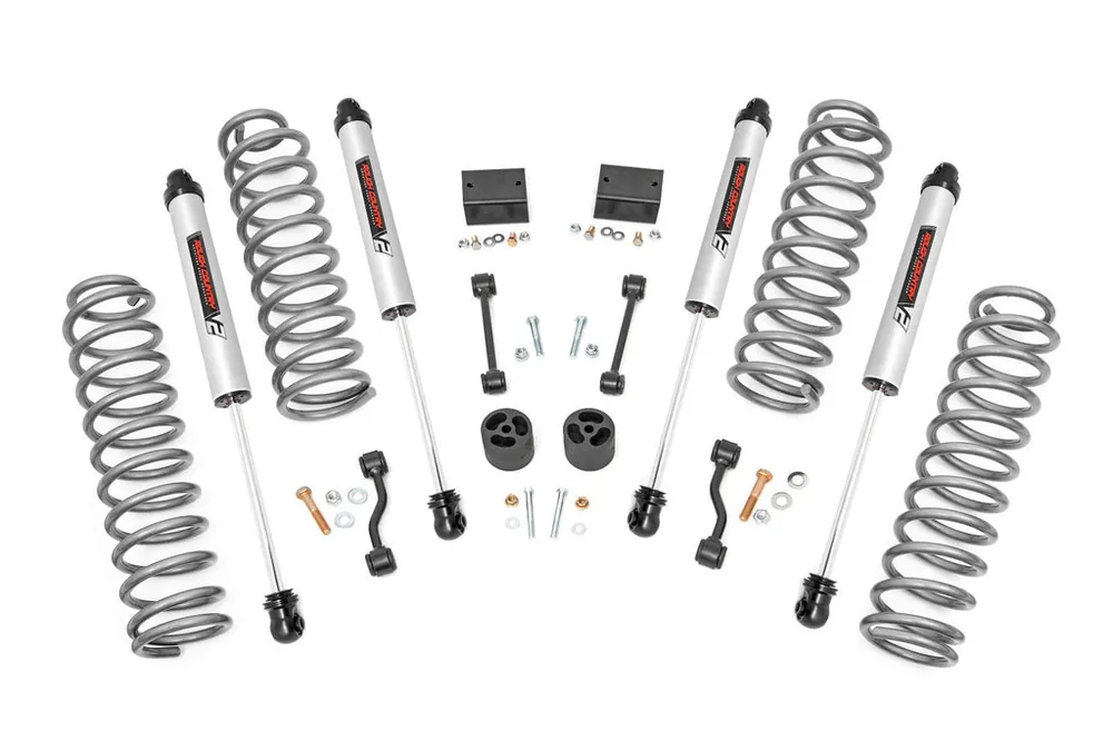 Put the finishing touch on your Jeep Wrangler JL 2-Door with Rough Country’s 2.5-Inch Suspension Lift Kit. This kit provides the clearance to easily run 35-inch tires, giving your JL a bold, trail-ready stance and taking its performance to new heights.Level Up Your Ride: Eliminate the factory nose-dive and achieve a sleek, leveled look. This lift kit levels the front with the rear, giving your Jeep a rugged stance that’s ready for any trail.Improved Off-Roading Performance: Gain the extra ground clearance you need to tackle challenging trails without worry. Optimized approach, breakover, and departure angles ensure your JL handles tough terrain with confidence.Ride Improvement: Linear coil rate springs improve handling and load support, enhancing ride quality both on and off the trail.Custom Shock Options: Configure your lift with nitrogen-charged N3 shocks, V2, M1 Monotube, or premium M1R shocks to match your preferred ride, from daily comfort to maximum off-road performance.Additional Tire Clearance: This kit clears up to 35-inch tires, giving your Jeep a bold, aggressive look that will turn heads on and off the road.Easy Bolt-On Installation: A hassle-free, 100% bolt-on design means you can install the lift quickly and get back to the trails without complex modifications.