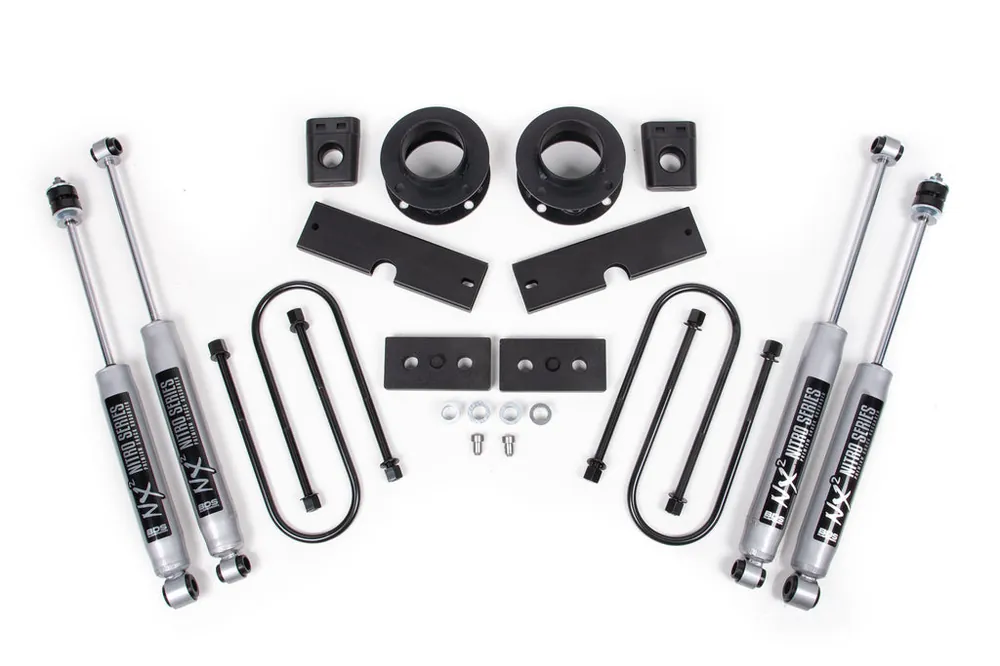 Level the front of your 2013-2023 RAM 3500 4WD truck by installing this 2-inch lift kit from BDS. Works on air ride equipped trucks only. Designed to improve stance this kit includes everything necessary to set your truck up right with clearance for up to 35″ tires at an affordable price. The lift kit includes steel fabricated coil spacers, extended bump stops, rear lift blocks, air bag spacer, and custom-tuned NX2 Nitro or FOX 2.0 Performance series shocks.