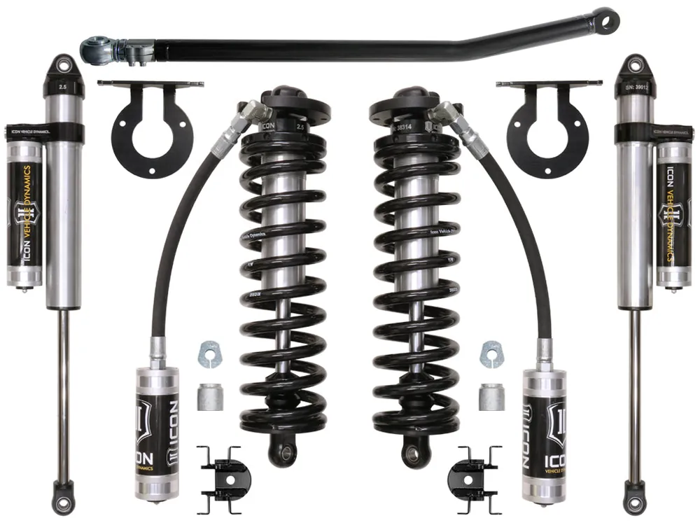 ICON’s 2.5 VS Series Remote Reservoir Bolt-In Coilover Conversion Kit will add a new level of performance and adjustability to 2005-2016 F-250 and F-350 trucks. The advantage of utilizing a coilover conversion kit is that they have been designed to increase the overall damping ability of the vehicle while at the same time allowing for user-defined ride height adjustment. The 2.5″ Remote Reservoir Coilover featured in these kits is based off of ICON’s 2.5 VS Series shock line – meaning that features like Eibach coil springs, FK Rod End bearings, and vehicle-specific valving come standard. Rear 2.5 Aluminum Series piggyback shocks feature one-piece impact extruded aluminum cylinders that offer lighter weight, improved corrosion resistance, and a more uniform finish than traditional plated steel cylinders. Quality machined components and a fully serviceable design make for a product that will stand the test of time, yet retain the ability to be rebuilt or re-valved as necessary.