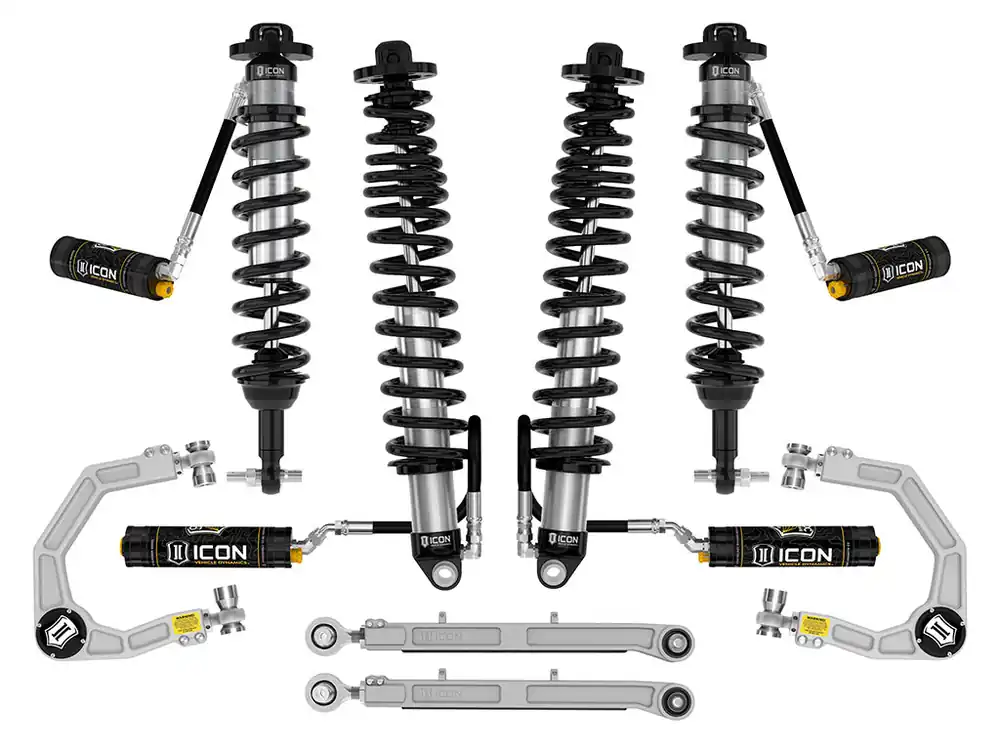 To accommodate the increased travel and lift height afforded by the ICON Coilovers, this Stage 6 kit comes with Billet Aluminum Upper Control Arms which provide on-vehicle caster and camber adjustability and feature our patented Delta Joint PRO, which allows for up to 90-degrees freedom of movement. ICON billet rear lower links employ dual-durometer greaseless bushings at one end, and massive FK rod ends at the other to provide the best combination of free articulation and ride quality while offering on-vehicle length adjustment.