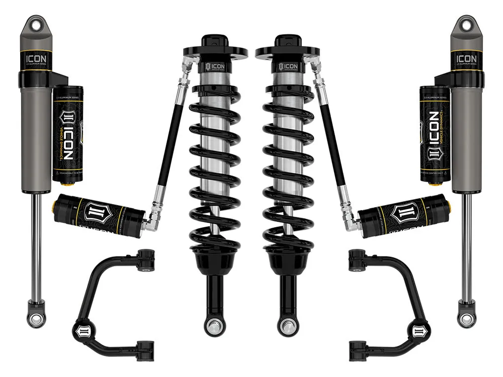 ICON Vehicle Dynamics 2021-2024 Ford F-150 4WD suspension systems are designed with maximum performance and the serious driver in mind. ICON engineers’ primary focus is to increase wheel travel and damping ability, which translates into outstanding vehicle control and ride quality both on and off-road. This Stage 3 system includes vehicle-specific tuned 2.5” coilover shocks featuring remote reservoirs for exceptional cooling properties and ICON-engineered coil springs for superior vehicle “feel” through the range of travel. These coilovers are also height adjustable for 2.75-3.5” of front lift over stock, allowing the use of larger, more aggressive wheel and tire combinations. Tubular Delta Joint Pro upper control arms on the F-150 not only add strength and durability, but help retain factory alignment spec range, increasing caster over stock and allow for the extra lift height this system provides. ICON 2.5 Aluminum Series piggyback reservoir rear shocks utilize a vehicle-specific valving and offer increased damping and head dissipation, balancing the performance of the truck from front to rear. The ICON Vehicle Dynamics 2021-2024 F-150 4WD Stage 3 suspension system is an excellent choice for those drivers looking to enhance the capabilities of their pickup on the road as well as in the dirt.