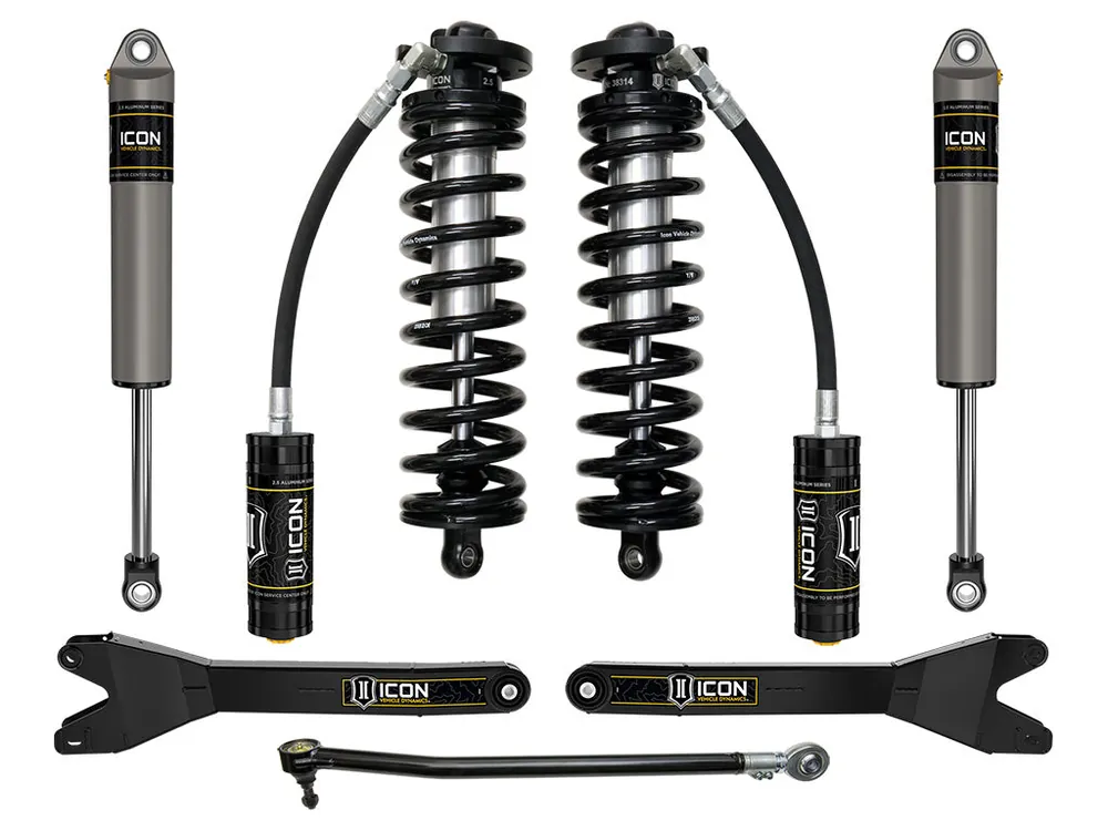 This ICON Vehicle Dynamics 2.5-3” coilover system is a great way to lift your 4WD 2023 Ford F-250/F-350 Super Duty while drastically improving ride quality and performance. The Stage 2 system is perfect for on-road and off-road use including towing, job site duty and general off-road adventure. The advantage of utilizing a coilover conversion kit is that they have been designed to increase the overall damping ability of the vehicle while at the same time allowing for user-defined ride height adjustment. The 2.5″ Remote Reservoir Coilover featured in these kits is based off of ICON’s 2.5 VS Series shock line – meaning that features like ICON engineered coil springs, FK Rod End bearings, and vehicle-specific valving come standard. ICON’s Stage 2 System is comprised of ICON 2.5 Series remote reservoir coilovers with adjustable ride height, fabricated Radius arms, and ICON 2.5 Aluminum Series internal reservoir rear shocks. This stage sees the inclusion of the ICON Vehicle Dynamics Ford Super Duty Radius Arm System that feature a sealed pivot bushing that minimizes road feedback and ensures a long life and quiet operation. Additionally, their fabricated, fully boxed design ensures strength and utilizes a profile optimized for tire clearance at full steering lock, making a 37” tall tire clear without coming in contact with the radius arm. With the endless hours ICON has spent testing and tuning our suspension components and shocks as a complete package, you can rest assured you have the best suspension solution on the market.