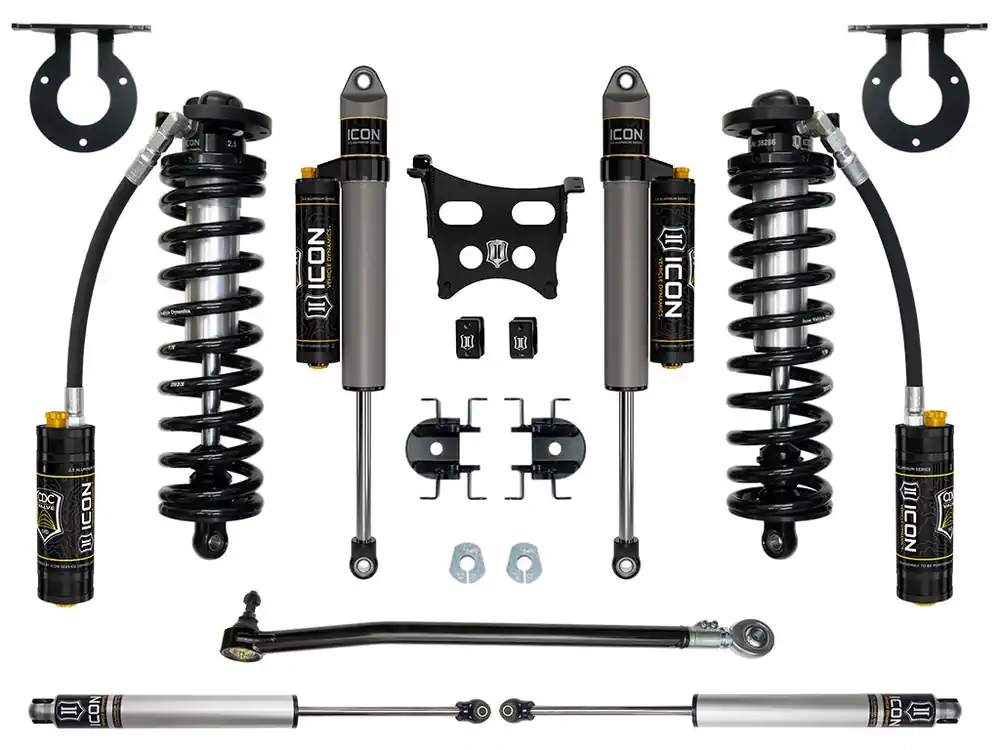 This ICON Vehicle Dynamics 2.5-3” coilover system is a great way to lift your 4WD 2023 Ford F-250/F-350 Super Duty while drastically improving ride quality and performance. The Stage 4 system is perfect for on-road and off-road use including towing, job site duty and general off-road adventure. The advantage of utilizing a coilover conversion kit is that they have been designed to increase the overall damping ability of the vehicle while at the same time allowing for user-defined ride height adjustment. The 2.5″ Remote Reservoir Coilover featured in these kits is based off ICON’s 2.5 VS Series shock line – meaning that features like ICON engineered coil springs, FK Rod End bearings, and vehicle-specific valving come standard. ICON’s Stage 4 System is comprised of ICON 2.5 Series CDCV remote reservoir coilovers with adjustable ride height, dual steering stabilizer kit with ICON 2.0 Aluminum Series stabilizers, on-vehicle adjustable front track bar, and ICON CDCV 2.5 Aluminum Series piggyback reservoir rear shocks, for those desiring an easy way to tune the ride externally with 10 settings, from soft to hard. With the endless hours ICON has spent testing and tuning our suspension components and shocks as a complete package, you can rest assured you have the best suspension solution on the market.