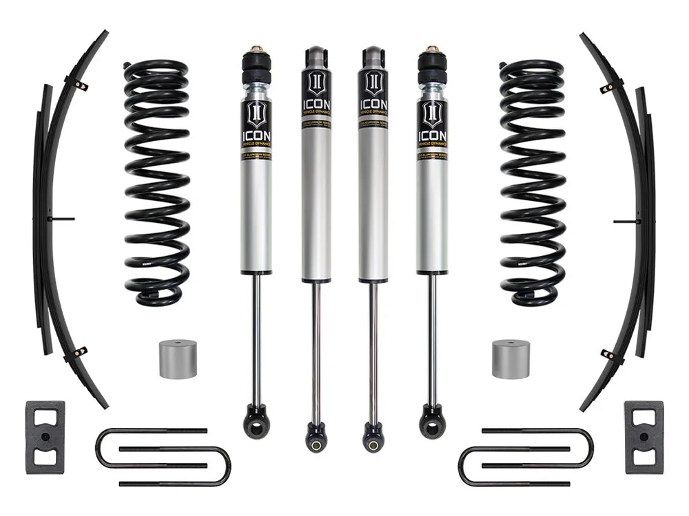 The ICON 2.5” suspension system is a great way to lift your 4WD 2023 Ford F-250/F-350 Super Duty while improving ride quality and performance. This entry level system is great for towing, rough construction site terrains, and country dirt roads all while keeping a smooth highway feel. ICON’s Stage 1 System is comprised of dual rate coil springs optimized for trucks equipped with gasoline engines, alignment cams for adding caster, rear leaf spring expansion packs with blocks and U-bolts for a more compliant ride and reduced axle wrap, and ICON 2.0 Aluminum Series internal reservoir shocks front and rear. With the endless hours ICON has spent testing and tuning our suspension components and shocks as a complete package, you can rest assured you have the best suspension solution on the market.