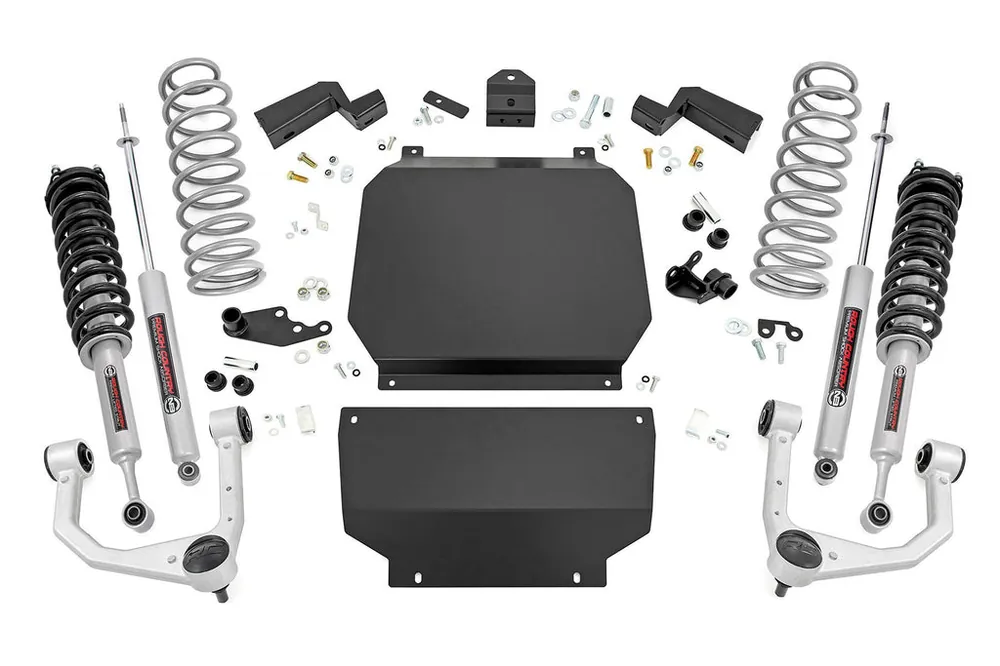 Set your Tundra apart from the pack. Give your new Tundra impressive good looks and more ground clearance with Rough Country’s 3.5″ Lift kit. Here at Rough Country we are overcoming the age-old problem of the nose-down look from the factory. With our 3.5″ suspension lift kit you will not only have the option to run larger sized tires but will lift and level you vehicle ensuing to catch the gaze of onlookers.\\Innovative Design. Rough CountryΓÇÖs 3.5-inch Bolt-On Kit features a set of high-quality, Forged Aluminum Upper Control Arms designed to make alignment adjustments easier and durable rubber bushings. These arms are designed to promote a factory-like geometry by keeping the ball joint at optimum angles after lifting. This design allows for an improved, greater range of motion from the ball joint, with less stress, wear and tear. Each unit is shipped complete ensuring that all components needed for installation are included.\\Installation. Featuring a 100% bolt-on installation process, installation couldn’t be easier. With an estimated timeframe of 4-6 hours this full kit can be installed at home using standard tools and can be completed efficiently and quickly!\\Lifetime Replacement Warranty. Rough Country’s 3.5″ Lift Kit is backed with a lifetime replacement warranty towards manufacturer defects. As such, the product is protected from structural and workmanship damage after the date of purchase. With our industry-leading warranty give yourself peace of mind when using Rough Country’s Suspension products!