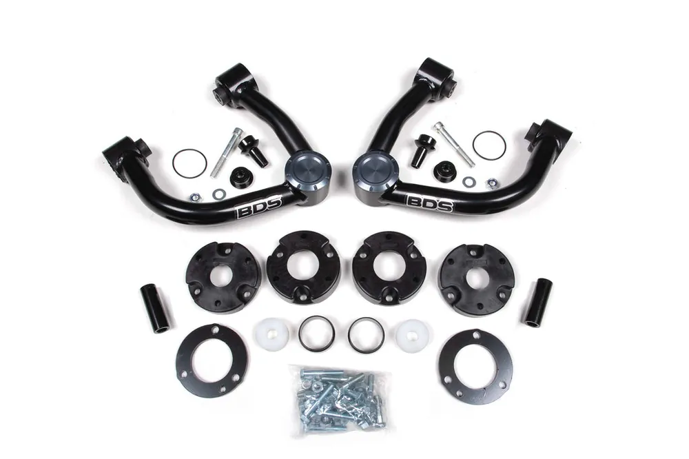 This 3 inch lift kit is engineered for additional tire clearance and improved performance without overextending the suspension or driveline angles at full suspension droop. To prevent maxing out ball joints or CV damage, BDS gets around this issue a small pre-load spacer is combined with a top spacer to properly achieve height.