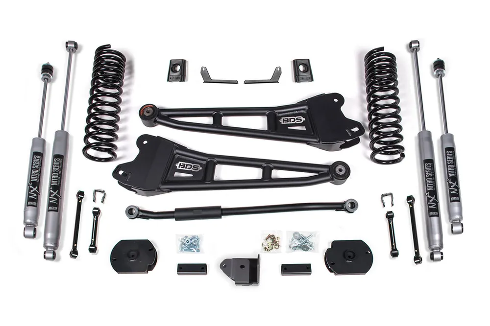 Level out and take your 2014-2018 RAM 2500 diesel powered truck with this 3-inch radius arm lift kit from BDS Suspension. Works with factory air ride equipped trucks only. Designed to improve stance, performance, and capability, this kit includes everything necessary to set your truck up right with clearance for up to 35″ tires.