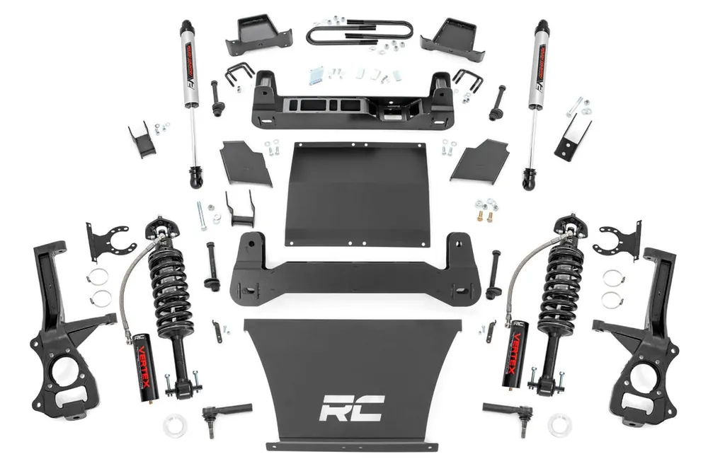 Explore New Heights: Transform your truck with Rough CountryΓÇÖs 4-inch Suspension Lift, perfectly designed to enhance the bold, aggressive styling of GMΓÇÖs all-new fourth-generation Sierra 1500 AT4 and Silverado 1500 Trailboss. These models, already equipped with GMΓÇÖs factory two-inch kit, are taken to the next level with Rough CountryΓÇÖs lift kitΓÇögiving your vehicle a commanding presence on and off the road. Whether you’re tackling tough trails or cruising through city streets, the Rough Country 4-inch Lift ensures improved performance and head-turning appeal.Innovative Design and Construction: When changing a vehicle’s suspension, the key to preserving ride quality is keeping the geometry of all suspension components as close to their factory angles as possible. This suspension kit combines the use of durable steel knuckles, differential brackets, and drop cross members to reduce cv angles and simulate factory angles all while achieving new heights. Featuring a set of upper strut spacers that offer uncompromised strength and rigidity, gaining lift height is no issue. Completing the rear of this suspension kit is a set of rear blocks, shocks, and u-bolts that allow you to retain factory-like geometry. This combined setup provides enough clearance to run 35″ tires without additional modifications. We didn’t want to limit you to one standard kit. Rough Country’s 4-inch kit is configurable with all the shock options that we offer. This allows you to choose which shock series you want! Ranging from our nitrogen-charged N3 shocks to our Vertex reservoir shocks the power to choose is in your hands.Installation: With minor cutting and a strut compressor required to install, an estimated timeframe of 8-10 hours is recommended to complete this full installation. This full kit can be installed at home and can be completed efficiently and quickly!Limited Lifetime Replacement Warranty: Rough Country’s 4″ Suspension Lift Kit is backed with a limited lifetime replacement warranty towards manufacturer defects. As such, the product is protected from structural and workmanship damage after the date of purchase. With our industry-leading warranty give yourself peace of mind when using Rough Country’s Suspension products!