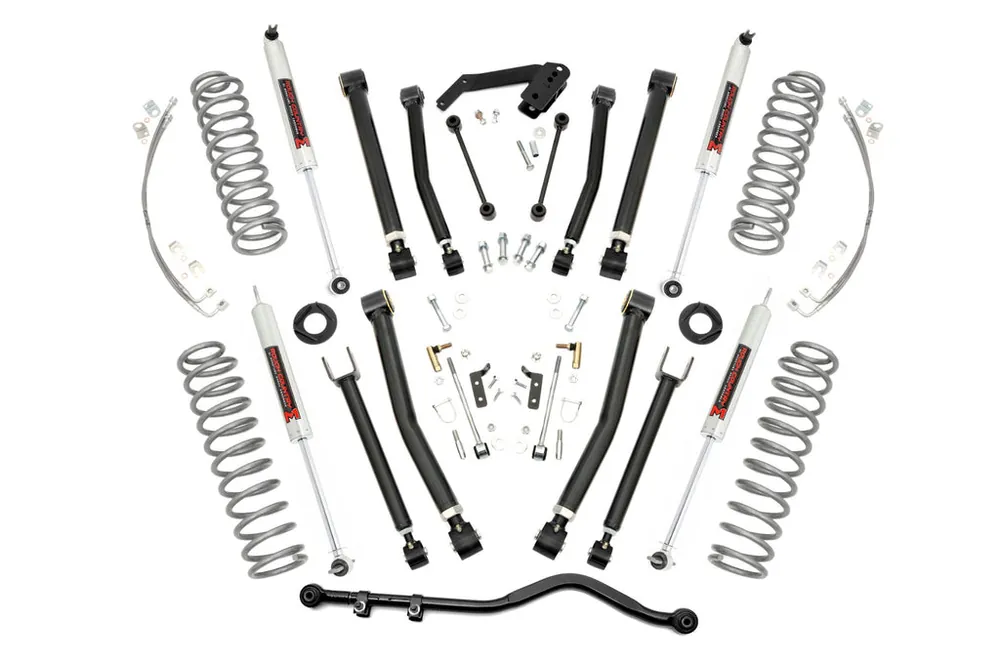 Total transformation on and off the trail starts with Rough Country’s 4-Inch X-Series Suspension Lift Kit for Jeep. This all-inclusive package delivers aggressive styling, increased ground clearance, and enhanced off-road capability for the ultimate upgrade.Precision Adjustable Control Arms: This kit includes front and rear upper and lower X-Flex Control Arms featuring a high-clearance design. Built with OEM-style rubber bushings, fully rebuildable flex joints, and massive 2.5-inch diameter bodies with 1.25-inch threads, these arms are fully greasable for long-lasting durability and superior articulation. Fine-tune your ride height and suspension geometry with ease.Optimized Suspension Geometry: Lifted coil springs and rear coil correction plates provide the perfect combination of ride height and vibration dampening. The correction plates adjust the rear coil spring angle by 10 degrees, allowing for optimal suspension performance across any terrain.Heavy-Duty Forged Adjustable Track Bar: Strength and stability are delivered by a 16-pound forged solid steel Adjustable Front Track Bar. This heavy-duty component outmatches stock parts, maintaining precise axle alignment and control even during extreme off-road flexing. It’s fully adjustable on the vehicle and easy to install.Custom Shock Options for Any Terrain: Select from nitrogen-charged N3 shocks, V2, M1 Monotube, or premium M1R shocks to match your driving style. From versatile daily comfort to maximum off-road control, this kit lets you tailor your suspension for any adventure.Confident, Balanced Stance: This lift kit levels the front of your Jeep with the rear, creating a commanding, well-balanced look that performs as good as it looks.Peace of Mind Guaranteed: Backed by Rough Country’s Limited Lifetime Replacement Warranty, you can hit the trails knowing your investment is protected.