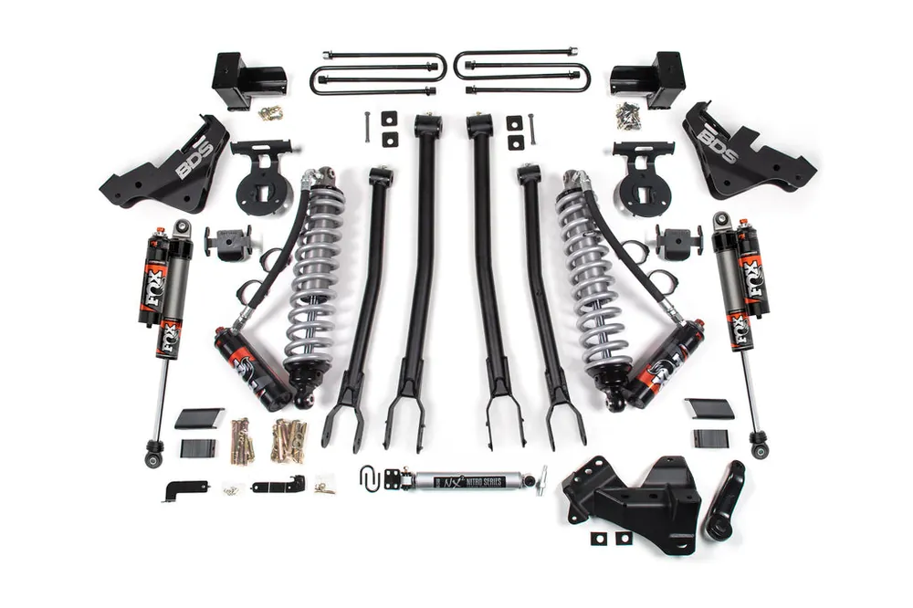Take your dual rear wheel “DRW” Ford F350 Super Duty diesel truck to the next level with this 5-inch 4-Link lift kit from BDS. Designed to improve stance, performance, and capability, this kit includes everything necessary to set your dually Ford truck up right with clearance for up to 37″ tires.