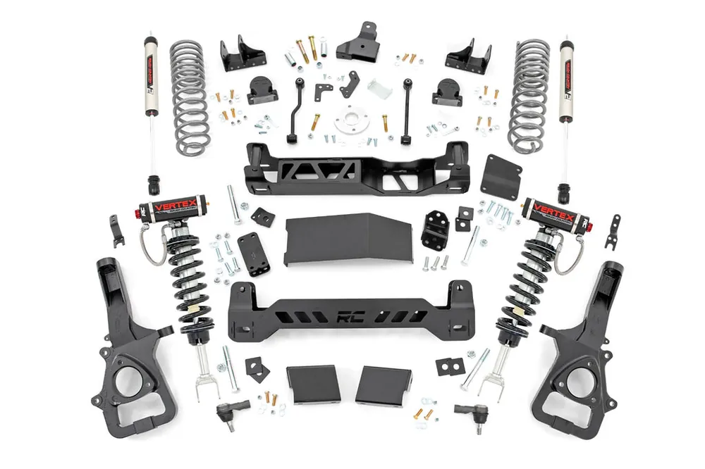 Explore New Heights. Ram’s updated fifth generation 1500 features an impressive all-new design that’s built from the ground up, with aggressive angles and head-turning stylings that fit in beautifully when transformed with Rough Country’s 6-inch Suspension Lift.Innovative Design and Construction. When changing a vehicle’s suspension, the key to preserving ride quality is keeping the geometry of all suspension components as close to their factory angles as possible. This suspension kit combines the use of durable steel knuckles, differential brackets, and drop cross members to reduce cv angles and simulate factory angles all while achieving new heights. Featuring a set of upper strut spacers that offer uncompromised strength and rigidity, gaining lift height is no issue. Completing the rear of this suspension kit is a set of rear coil spacers, track bar relocation bracket, and sway bar links that allow you to retain factory-like geometry. This combined setup provides enough clearance to run 35″ tires without additional modifications.Installation. With minor cutting and a strut compressor required to install, an estimated timeframe of 7-8 hours is recommended to complete this full installation. This full kit can be installed at home and can be completed efficiently and quickly!Limited Lifetime Replacement Warranty. Rough Country’s 6″ Suspension Lift Kit is backed with a limited lifetime replacement warranty towards manufacturer defects. As such, the product is protected from structural and workmanship damage after the date of purchase. With our industry-leading warranty give yourself peace of mind when using Rough Country’s Suspension products!