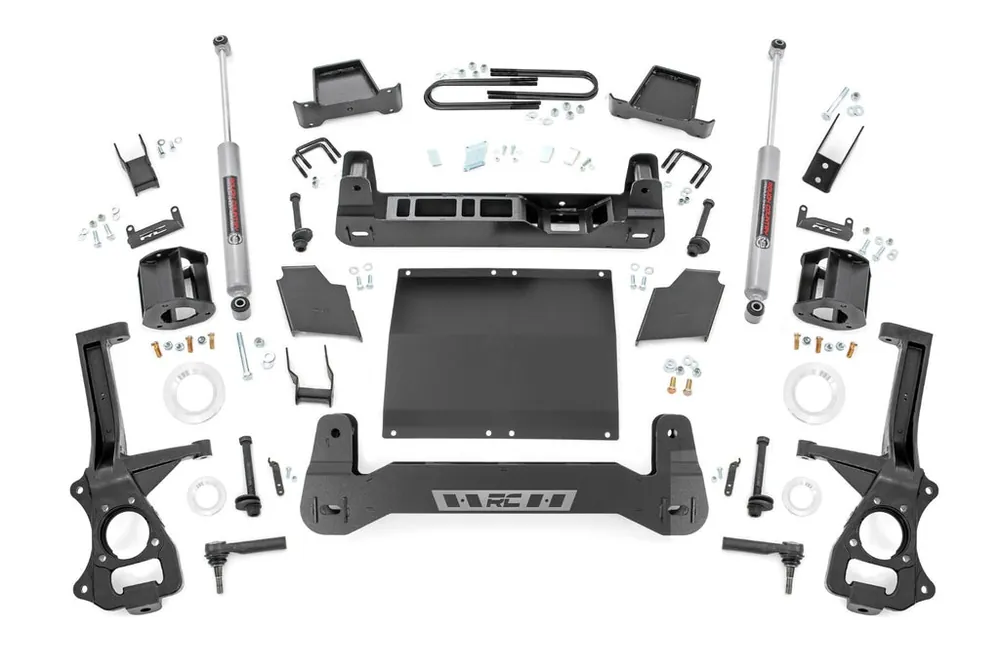 Explore New Heights: GMC’s fourth generation Sierra 1500 features an impressive all-new design that’s built from the ground up, with aggressive angles and head-turning stylings that fit in beautifully when transformed with Rough Country’s 6-inch Suspension Lift.Innovative Design and Construction: When changing a vehicle’s suspension, the key to preserving ride quality is keeping the geometry of all suspension components as close to their factory angles as possible.This suspension kit combines the use of durable steel knuckles, differential brackets, and drop cross members to reduce cv angles and simulate factory angles all while achieving new heights. Featuring a set of upper strut spacers that offer uncompromised strength and rigidity, gaining lift height is no issue. Completing the rear of this suspension kit is a set of rear blocks, shocks, and u-bolts that allow you to retain factory-like geometry. This combined setup provides enough clearance to run 35″ tires without additional modifications. We didn’t want to limit you to one standard kit. Rough Country’s 6-inch kit is configurable with all the shock options that we offer. This allows you to choose which shock series you want! Ranging from our nitrogen-charged N3 shocks to our Vertex reservoir shocks the power to choose is in your hands.Installation: With minor cutting and a strut compressor required to install, an estimated timeframe of 8-10 hours is recommended to complete this full installation. This full kit can be installed at home and can be completed efficiently and quickly!Limited Lifetime Replacement Warranty: Rough Country’s 6″ Suspension Lift Kit is backed with a limited lifetime replacement warranty towards manufacturer defects. As such, the product is protected from structural and workmanship damage after the date of purchase. With our industry-leading warranty give yourself peace of mind when using Rough Country’s Suspension products!