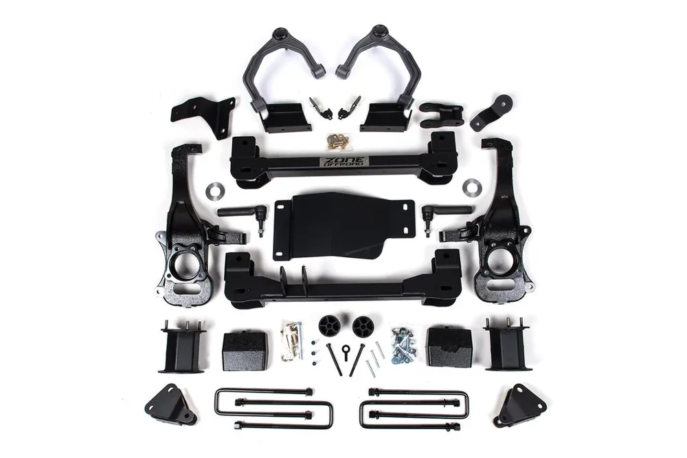 Take your GMC Denali 1500 to new heights with this 6″ lift kit from Zone Offroad. These kits are designed to allow full functionality oft he ARC (adaptive ride control) system factory installed on the Denali to retain all the features of your truck at the new lift height. Kits include everything needed from high strength crossmembers and steering knuckles to strut spacers and ARC sensors, adventure series upper control arms, differential relocation brackets and more. Get the look, performance, and capability your truck deserves with clearance for up to 35″ tires.