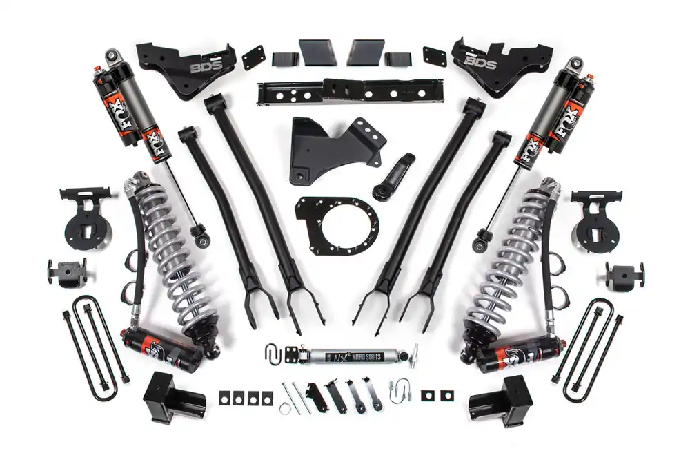 Maximize the capability of your dual rear wheel Ford F350 Super Duty diesel powered truck with this 4-inch lift kit with 4-Link and FOX 2.5 Performance Elite Coil-over conversion from BDS Suspension. Designed to improve stance, performance, and capability, this kit includes everything necessary to set your dually truck up right with clearance for up to 38″ tires.