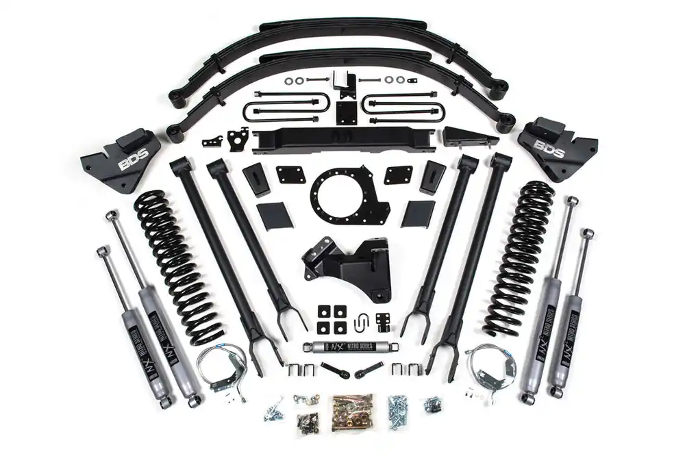 Take your Ford F250 and F350 Super Duty gas truck to the next level with this 9-inch 4-Link lift kit from BDS. Designed to improve stance, performance, and capability, this kit includes everything necessary to set your truck up right with clearance for up to 40″ tires.