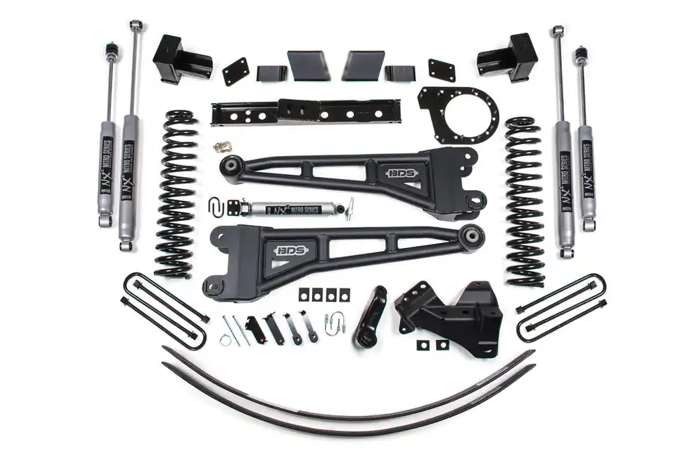 Take your 2017-2019 Ford Super Duty F250 and F350 diesel truck to the next level with this 6-inch radius arm lift kit from BDS. Designed to improve stance, performance, and capability, this kit includes everything necessary to set your truck up right with clearance for up to 38″ tires.