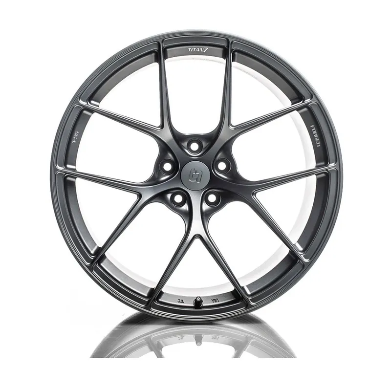 TITAN 7 T-S5 is a fully forged wheel designed completely with performance in mind. Pressurized with 10,000 TONS of industry leading pressure to give you a wheel that is incredibly strong while giving you all of the performance attributes you need in a track focused wheel. Upon close inspection you will notice strength adding ridges which have been strategically placed to give the wheel rigidity while keeping weight to a minimum. The split 5 spoke design was chosen for its motorsports heritage and track worthy structure. Each wheel from Titan 7 features traction improving bead seat knurling, beefed up inner rim flange for durability and strength, and logo machined accents. The T-S5 is designed for each application to clear all popular after market big brake kits while achieving maximum concavity. All wheels are durability tested according to JWL standards to ensure safety while you perform. Authentic performance from Titan 7. Forged for All.