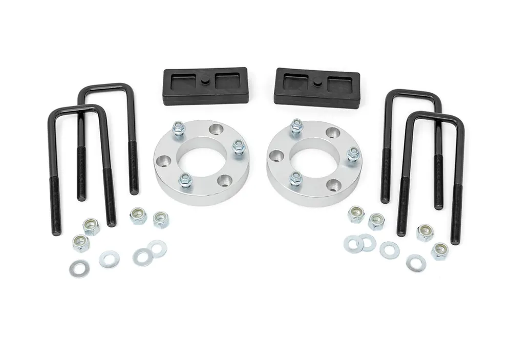 Increased Ground Clearance. Level your second-generation Titan from front to rear while giving your truck a more aggressive look with Rough CountryΓÇÖs 2-inch Leveling Lift Kit for Nissan Titan trucks. Nissan’s Titan comes with a factory rake, leaving the rear much higher than the front. This simple solution raises the front and rear, providing additional ride height while leveling the front with the rear for a more striking visual appeal and the ability to run larger tires and wheels.\\Innovative Design and Construction. This easy-to-install, innovative Aluminum Spacer combines great looks and strength, while providing 2 inches of lift. This spacer features aircraft quality, T6061 Billet Aluminum offering enhanced durability against elements like rain and rust Featuring a durable set of rear lift blocks and u-bolts this innovative kit allows the vehicle to retain factory-like geometry and provides enough clearance to run 33″ tires with appropriate wheel backspacing.\\Installation. With a no-cut or drilling required to install, installation couldn’t be easier. With an estimated timeframe of 3-4 hours, this full kit can be installed can be completed efficiently and quickly!\\Limited Lifetime Replacement Warranty. Rough Country’s 2-inch Leveling Lift Kit is backed with a limited lifetime replacement warranty towards manufacturer defects. As such, the product is protected from structural and workmanship damage after the date of purchase. With our industry-leading warranty give yourself peace of mind when using Rough Country’s Suspension products!