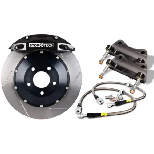 A StopTech Big Brake Kit represents the ultimate high performance brake upgrades and gives vehicles that supercar look and feel.StopTech Big Brake Kits exceed stock performance in two key areas: First, larger rotors increase heat capacity, allowing a driver to brake harder stop-after-stop with reduced chance of fade. Second, stiffer calipers and stainless steel lines reduce system compliance, providing consistent pedal feel and confidence-inspiring responsiveness.The key, however, is to increase heat capacity and reduce compliance without upsetting a vehicle’s stock front-to-rear brake torque ratio. That is why StopTech developed the Balanced Brake Upgrade design philosophy, which precisely apportions front and rear braking resources while factoring in vehicle weight transfer under braking. In contrast, a brake upgrade that adds too much front torque (as many do), will reduce your car’s ability to maximize the traction available from all four tires, robbing you of performance. In addition, a system that uses too many pistons or pistons that are too large will make the brake pedal much more difficult to modulate, limiting a driver’s control of brake input.*The Stiffest, Fully Forged 2-piece, Opposed Piston Calipers*StopTech 2-piece calipers have the lowest amount of flex and deflection among 25 of the leading caliper models (including some monoblocks) from well-known manufacturers. This is accomplished using StopTech’s patented bolt-in bridge, which is strong enough to stop distortion without sacrificing cooling through the top of the caliper.The standard StopTech caliper finish is a glossy high temperature paint available in one of six different colors – red, black, silver, blue, yellow and gold.Trophy Sport and Trophy Race Big Brake Kits use weight-optimized STR calipers finished with a deep natural anodized coating that resists fading and discoloration at extreme temperatures. * Less vibration * Less Noise * Better pedal feel under extreme braking conditions * Faster braking response * Less pad taper*Patented AeroRotors and AeroHats that offer up to 80% greater airflow*StopTech has developed several design innovations to improve rotor airflow. The patented 2-piece AeroRotors push more air thanks to curved, airfoil-shaped vanes and an air channel that widens at the trailing edge of the vanes. StopTech aluminum AeroHatsare lighter, and feature directional stand-offs between the rotor and mounting hat that increase airflow to the (hotter) outside face of the rotor by over 15%. * Specifically engineered and patented AeroVanes for optimum cooling * Optimized to provide even performance and consistent feedback * Longer pad and rotor life*Hard Anodized 6061-T6 Billet aluminum Mounting Brackets with Stainless Steel Studs*Application-specific hardware that is stronger than most competitors, with studs instead of the more commonly used bolts and hard anodized aluminum billet composition. * Hard anodized billet aluminum mounting brackets * Stainless steel studs secured with set screws for strength and durability * Fully machined aluminum or steel that is precise and strong * Application specific design for precise and proper fitment * All necessary hardware for easy installation*StopTech Stainless Steel Brake Line Kits*Braided stainless steel lines reduce system compliance and improve brake pedal feel and modulation. StopTech’s Stainless Steel Brake Lines are D.O.T. compliant and designed to fit your vehicle. * Stainless steel braiding for lower compliance and extra protection * Provides quicker response * Firmer pedal feel * A variety of fittings for hundreds of applications * All necessary brackets and fasteners for easy installation * Better brake modulation * D.O.T. compliant*StopTech Street Performance Brake Pads*StopTech Street Performance Brake Pads are included in all Big Brake Kits besides the track-only Trophy Race Big Brake Kits.StopTech Street Performance Pads are intended for high performance street driving as well as light duty track use. * Aggressive pad for high performance street driving * Para-aramid composites provide linear response regardless of pad temperature * 100% positive molded for uniform friction material density * Low dust formulation is rotor friendly and leaves wheels cleaner * Scorched to raise initial cold effectiveness and ease bed-in * 100% Asbestos-free formulas