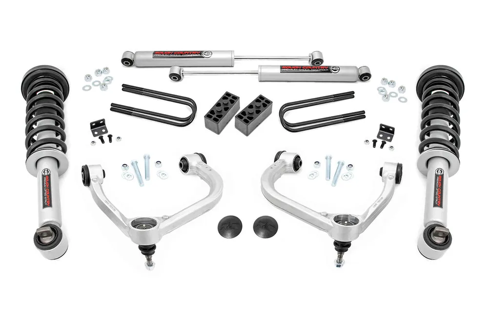 Elevate your ride with Rough Country’s 3-inch Bolt-On Lift Kit-engineered for easy installation, aggressive styling, and unbeatable performance. This premium lift kit delivers enhanced ground clearance, a leveled stance, and smooth ride quality, making it the perfect upgrade for your ninth-generation Ford F-150.Premium Construction for Maximum Durability: Built for strength and performance, this kit features forged aluminum upper control arms that enhance suspension durability while optimizing ball joint angles to minimize wear and tear. Durable rubber bushings provide a smoother ride and extended lifespan, ensuring long-term reliability. Rear lift blocks complete the setup, allowing you to fit up to 34-inch tires while maintaining a clean, level stance from front to rear.Hassle-Free, Bolt-On Installation: Designed for a seamless upgrade, this kit requires no cutting or drilling and can be installed with basic tools in a home garage. It’s fully reversible, so you can return your truck to stock at any time. Plus, it’s compatible with all Rough Country shock and strut options, from nitrogen-charged N3 shocks to premium Vertex reservoirs, letting you dial in your ride quality.Backed by a Limited Lifetime Warranty: Rough Country stands behind the quality of its products. This lift kit comes with a limited lifetime replacement warranty, giving you peace of mind against structural and workmanship defects.Upgrade your Ford F-150 today with Rough Country’s 3-inch Bolt-On Lift Kit and experience superior performance on and off the road!