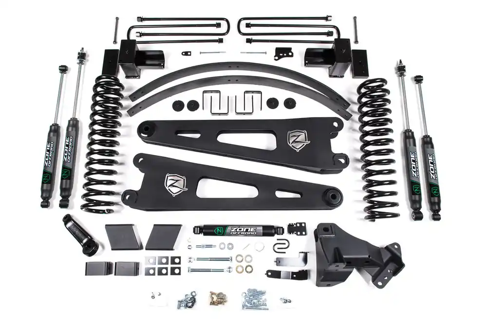 Take your Super Duty to new heights with this 6″ lift kit from Zone Offroad. Kits include everything needed from full length coil springs and stout radius arms to steering correction and rear lift to level the stance. Get the look, performance, and capability your truck deserves with clearance for 38″ tires.