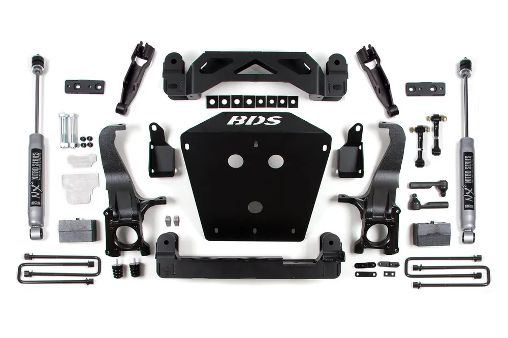 This kit takes advantage of BDS’s tried and true high-clearance design for improved ground clearance, strength, and offroad protection while correcting suspension and steering geometry for great on-road handling characteristics. Up front, the kit utilizes a lower strut extension, high-arched 1/4-inch thick steel crossmembers along with a multipiece differential relocation brackets and heavy duty skid plates built for offroad protection. Steering geometry is corrected at the new taller ride height with CNC-machined ductile iron steering knuckles utilizing replacement tie rod ends allowing for ESC system compatibility. These combined with the provided sway bar drops, bump stop extensions, brake line brackets, supplied hardware and more provide a comprehensive front suspension lift ready for whatever you throw at it.