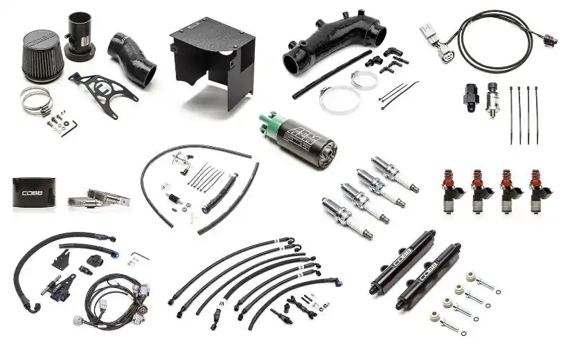The Subaru Stage 1 to NexGen Stage 2+ Flex Fuel Power Package for STI Includes: SF Intake & Airbox, Silicone Turbo Inlet V2, Throttle Body Coupler, Spark Plugs, Top Feed 1050x Fuel Injectors, High Flow Fuel Pump, Fuel Pressure Regulator for Fuel Rail Kit, Fuel Rail Line Kit, Fuel Rails, NexGen Flex Fuel Ethanol Sensor Kit, Fuel Pressure Sensor Kit & the COBB Vehicle Badge.