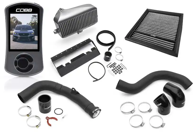 The Stage 2 Power Package Includes the Accessport, Silver Top Mount Intercooler kit, Charge Pipe, High Flow Filter, Intake Tube and a COBB Badge for the 2022-2023 Subaru WRX 6MT or CVT.