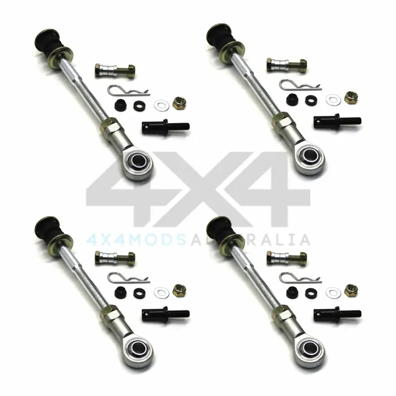 This kit contains front & rear adjustable sway bar link/disconnects to suit all GQ coil rear wagon & ute variations. Sway bar disconnects are designed to allow sway bars to work as intended while on road and then disconnect to allow free suspension movement without restriction from the sway bar when off road. Supplied with bolts to use as a fixed extended sway bar link pin.