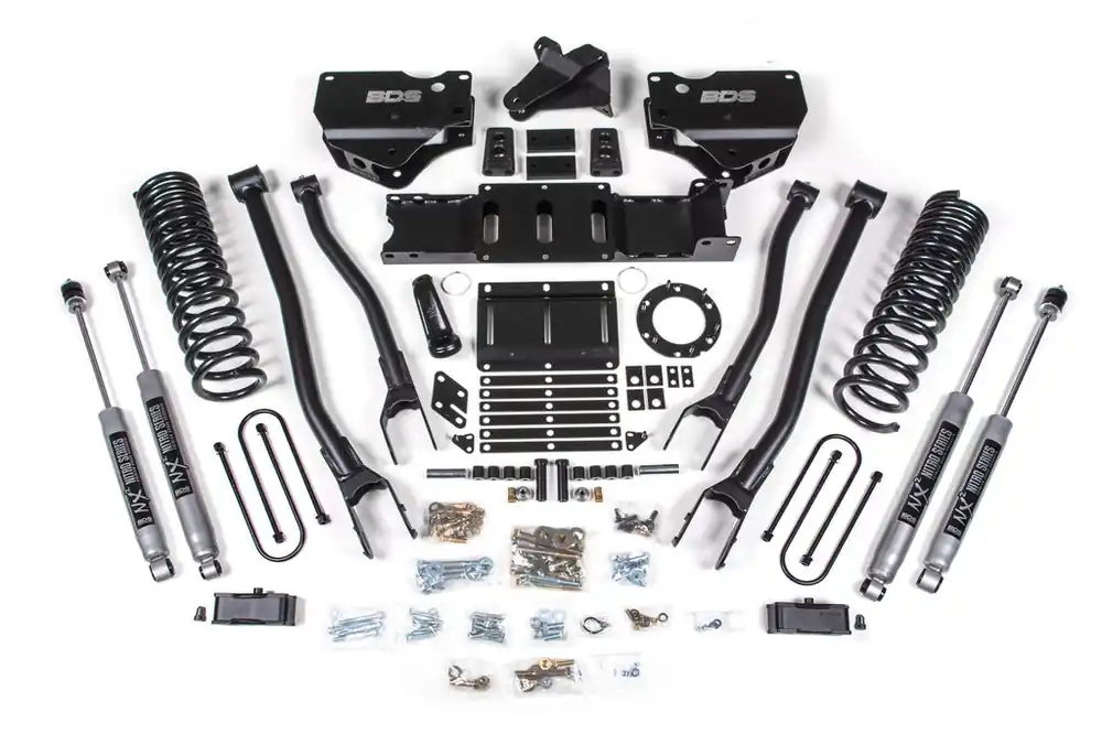 Raise your RAM 3500 gas powered truck to the next heights with this 4-inch lift kit with 4-Link conversion from BDS Suspension. Designed to improve stance, performance, and capability, this kit includes everything necessary to set your truck up right with clearance for up to 35″ tires.