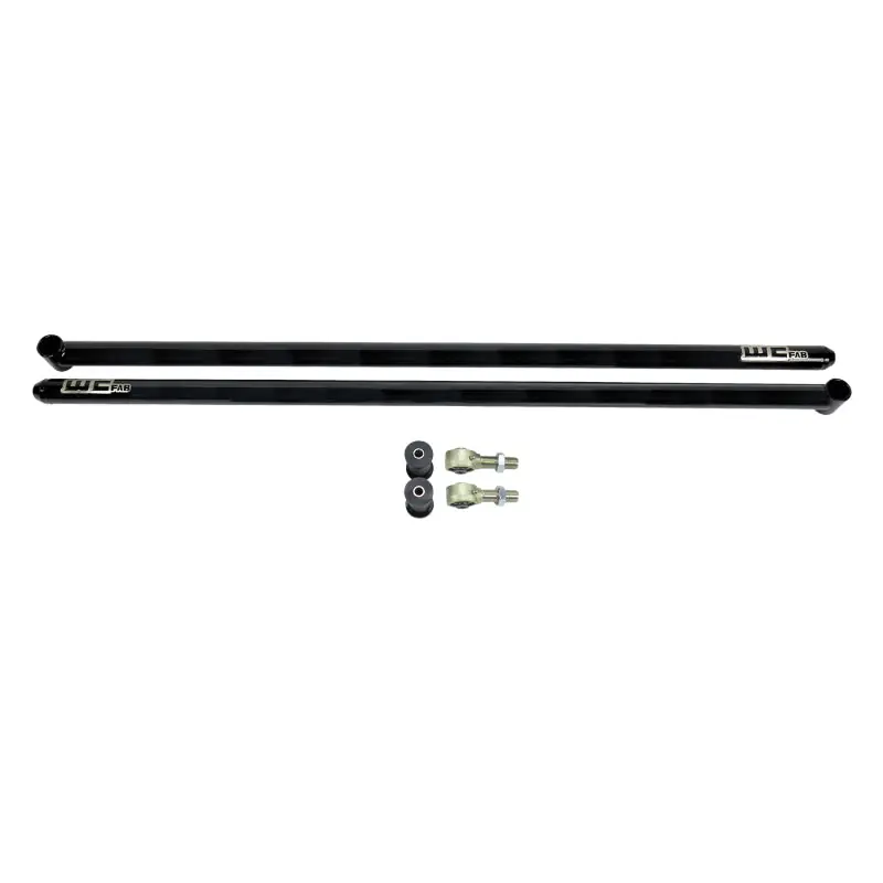Traction bars are a necessary upgrade when increasing the horsepower on your truck to prevent the axle from twisting which can lead to broken u-joints, driveshafts, and even twisted axle housings. These Universal Fabricator Series 68″ Traction Bars from WCFab include the essentials, allowing you to customize the mounts for your specific application. Features High quality RockJock rebuild-able and grease-able Johnny Joint heim connections at the frame side connection for the bars. Heavy Duty Poly Urethane Bushing at the axle side connection for decreased noise and vibration (common complaint when solid heims are used on both ends). WCFab traction bars are all finished with their professional in house powder coat process in your color choice and come standard with a epoxy primer base coat before the final color to increase corrosion resistance by more than ten times compared to just your standard powder single coat application. Made in USA.
