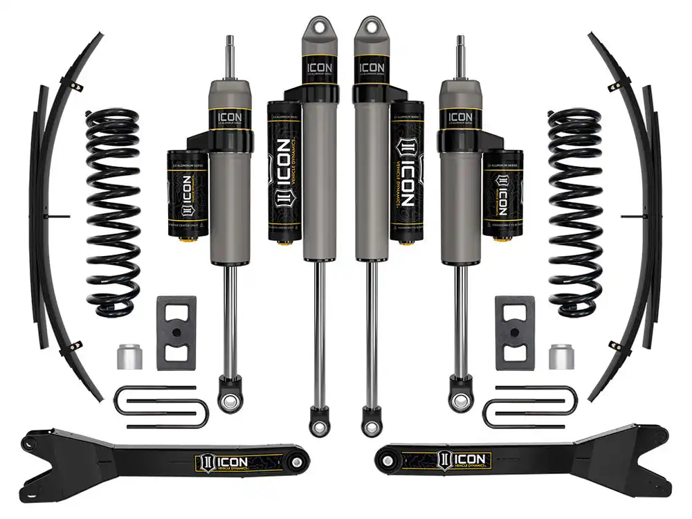 This ICON Vehicle Dynamics 2.5” suspension system is a great way to lift your 4WD 2023 Ford F-250/F-350 Super Duty while drastically improving ride quality and performance. The Stage 2 system is perfect for on-road and off-road use including towing, job site duty and general off-road adventure. ICON’s Stage 2 System is comprised of dual rate coil springs optimized for trucks equipped with diesel engines, fabricated radius arms, rear leaf spring expansion packs with blocks and U-bolts for a more compliant ride and reduced axle wrap, and ICON 2.5 Aluminum Series front and rear piggyback reservoir shocks. This stage sees the inclusion of the ICON Vehicle Dynamics Ford Super Duty Radius Arm System that feature a sealed pivot bushing that minimizes road feedback and ensures a long life and quiet operation. Additionally, their fabricated, fully boxed design ensures strength and utilizes a profile optimized for tire clearance at full steering lock, making a 37” tall tire clear without coming in contact with the radius arm. With the endless hours ICON has spent testing and tuning our suspension components and shocks as a complete package, you can rest assured you have the best suspension solution on the market.