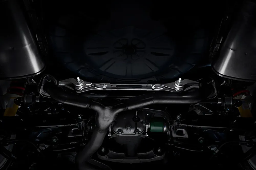 Crafted to work seamlessly with the STI flexible tower bar, this rear subframe support connects the rear cross member to the vehicle body using a rubber bushing. Its unique design balances stiffness and flexibility, optimizing rear chassis rigidity without sacrificing ride comfort. This results in faster, more responsive steering and improved cornering stability on all four wheels, making it ideal for spirited street driving and track use.