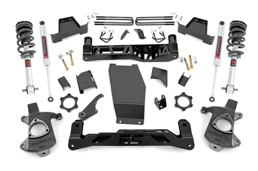 Level Up Your Stance and Style: Transform your Chevy or GMC 1500 with Rough Country’s 6-Inch Lift Kit-engineered to eliminate factory rake and deliver a bold, level, and aggressive appearance. This kit supports 33-inch tires on factory 20-inch wheels, so you can keep your OE styling while gaining serious off-road presence. The high-clearance crossmember design boosts ground clearance, ensuring you’re ready for rugged terrain without compromising ride quality.Engineered for Strength and Precision: Every component in this lift kit is crafted for top-tier durability and performance. Heavy-duty fabricated lift blocks outlast cast versions, while anti-axle wrap rear blocks help maintain factory ride comfort and prevent axle wrap under load. All suspension parts are precision laser-cut using advanced CAD technology for a perfect, factory-style fit. Choose between our nitrogen-charged N3 shocks or the M1 Monotubes to customize your ride experience.Everything You Need in One Kit: This all-inclusive lift kit comes complete with detailed instructions and all required hardware for a straightforward installation. Some cutting and drilling may be necessary, but we’ve made sure the process is as smooth as possible. Backed by Rough Country’s Limited Lifetime Warranty, your investment is protected mile after mile. Take your truck’s capability and stance to the next level today.