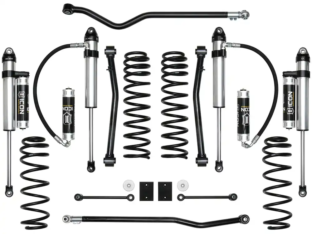 The ICON Vehicle Dynamics Stage 5 2.5″ Suspension System for the 2018-UP Jeep Wrangler JL is designed for the driver looking to drastically improve the performance and ride quality of their vehicle. This Stage 5 system includes 2.5″ lift dual rate coil springs, upgraded 2.5 Aluminum Series shocks with vehicle specific valving, tubular steel front lower links, adjustable front and rear track bars, bump stop spacers, sway bar links, and all necessary hardware to complete the installation. With this combination of components, ICON was able to increase wheel travel numbers by over 30% (3″ front, 2″ rear), redefining the potential of the 2018-UP JL. The front lower links included with this system are constructed from thick wall steel tubing, provide increased castor numbers, and feature dual durometer bushings for noise free operation, maximum articulation, and minimal bind. The Stage 5 system allows for fitment of 35″ tires when used with ICON’s recommended wheel specifications. For users looking to install 37″ tires, an optional bump stop spacer kit (PN: 22029) is available.