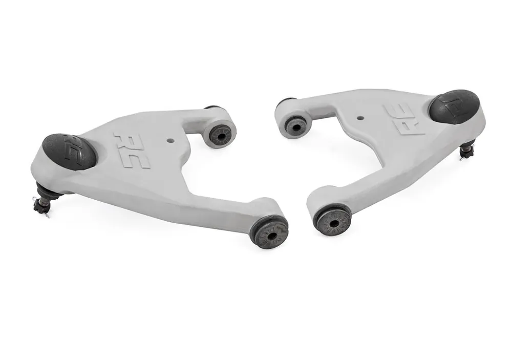 Unmatched Strength and Durability: Take your truck to the next level with Rough CountryΓÇÖs most durable Upper Control Arm yet! Crafted from forged solid aluminum, these Upper Control Arms deliver unmatched strength and long-lasting durability. The 1-piece forged design eliminates any welding weak spots, ensuring superior integrity that resists bending or breaking.Enhanced Articulation for Optimal Performance: Rough CountryΓÇÖs Forged Upper Control Arms are equipped with POM ball joints for a greater range of motion, offering more wheel articulation compared to standard or OE replacements. These high-performance ball joints feature a Polyoxymethylene ball race with a low coefficient of friction, resulting in longer life and smoother movement. A larger ball diameter enhances articulation while the maintenance-free design keeps performance high. Plus, each ball joint is fully greasable, ensuring ongoing smooth operation.Durable and Reliable Bushings: Additionally, Rough CountryΓÇÖs Forged Upper Control Arms include durable OEM-style rubber bushings, engineered for superior quality and reliable performance, making them a durable choice for any lifted application.
