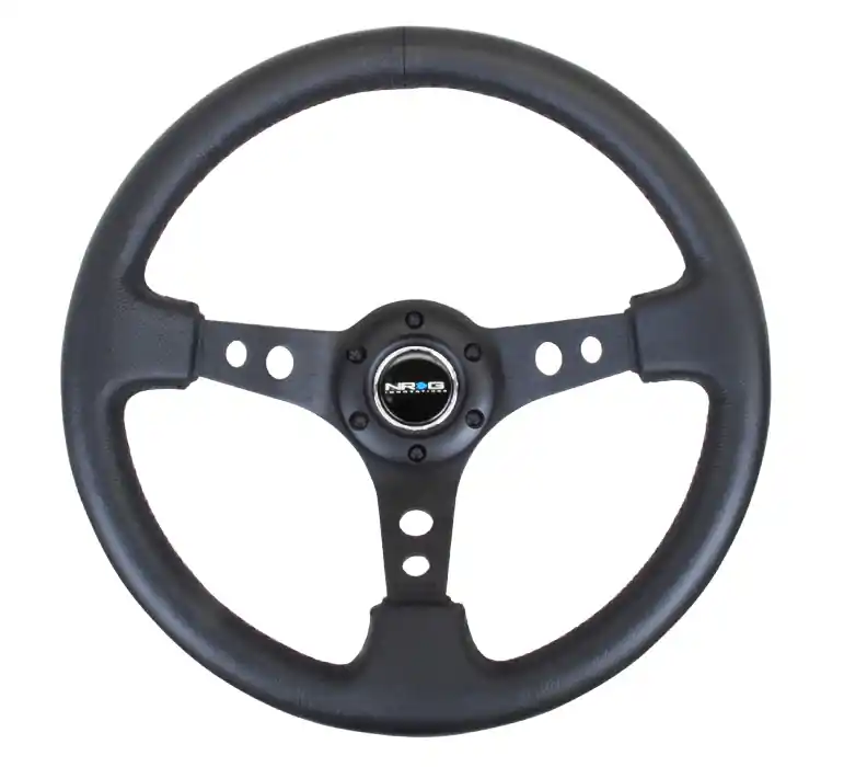 - Product: 350MM Deep Dish Steering Wheel w/ Holes, Black Center, Black Stitching and Black Leather Grip