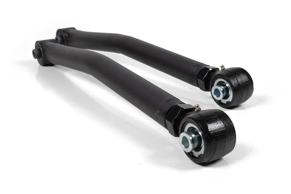 The axle side utilizes an OE-style rubber bushing for long service-free operation and better isolation of the noise, vibration, and harshness associated with driving across various terrain. The frame mount side features a large forged end for strength and durability and is available with either OE-style rubber bushings or flex ends that allow up to 30-degrees of misalignment for greater articulation. These arms are compatible with 2-6.5″ of lift and finished in a durable textured black powdercoat for excellent corrosion resistance.