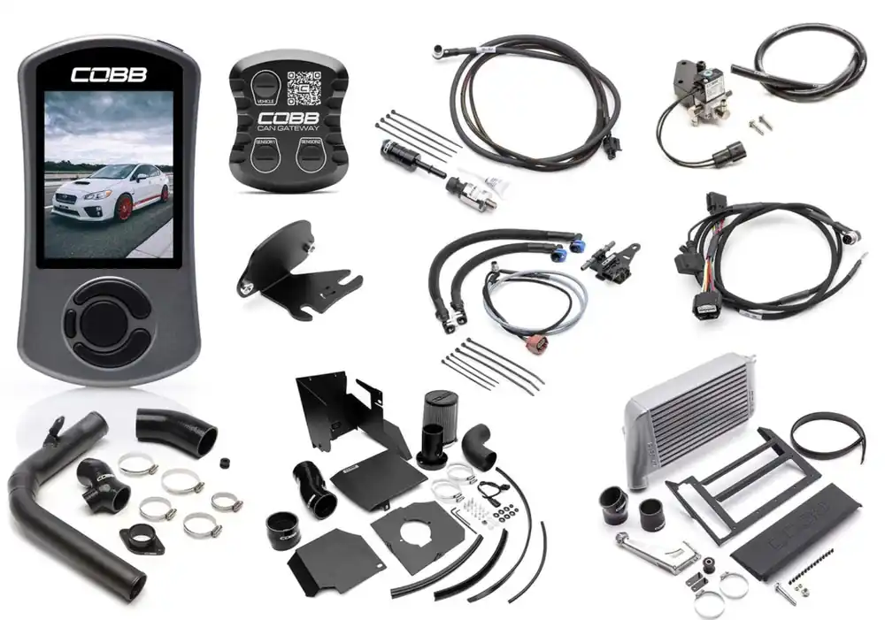 The Subaru NexGen Stage 2 + CAN Flex Fuel Power Package includes an Accessport V3, SF Intake System, CAN Flex Fuel Upgrade (CAN Gateway Module with Harness / Bracket and Ethanol Sensor), CAN Fuel Pressure Sensor Kit, Charge Pipe Kit, Top Mount Intercooler Silver, 3-Port Boost Control Solenoid (BCS) & COBB Vehicle Badge for the Subaru WRX 6MT 2015-2017!
