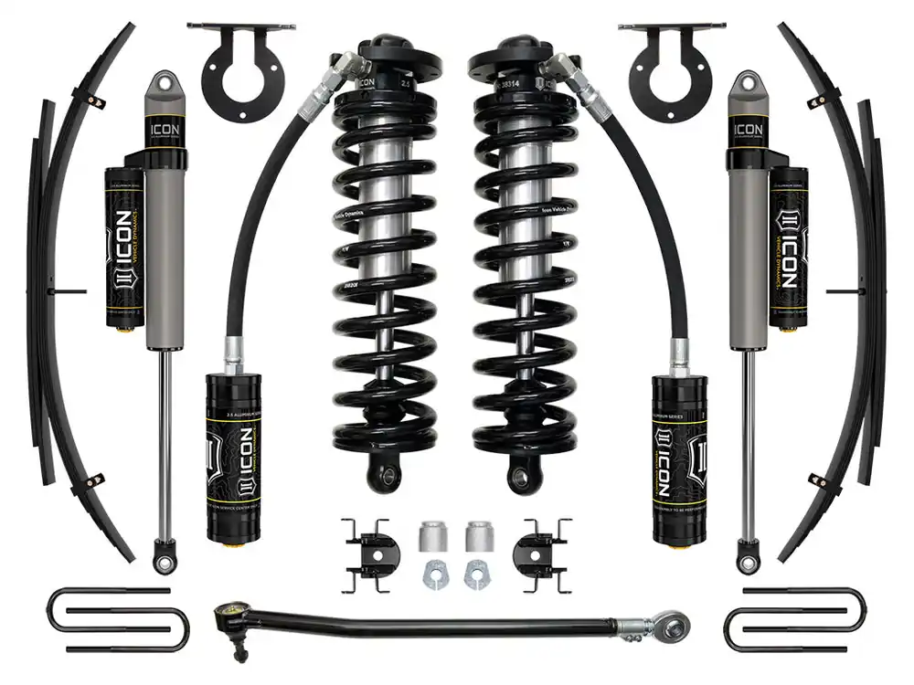 The ICON coilover conversion suspension system is a great way to lift your 4WD 2017-2023 Ford F-250/F-350 Super Duty while improving ride quality and performance. This upgraded Stage 3 system is great for towing, rough construction site terrains, and country dirt roads all while keeping a smooth highway feel. ICON’s Stage 3 System is comprised of 2.5 Series remote reservoir coilovers that are adjustable from 2.5-3” or 3.25-3.75 of front lift over stock (depending on year model and option package), adjustable front track bar with massive FK rod end, alignment cams for adding caster, rear leaf spring expansion packs with blocks and U-bolts for a more compliant ride and reduced axle wrap, nd ICON 2.5 Aluminum Series piggyback reservoir rear shocks. ICON 2.5 Series remote and piggyback reservoirs ensure optimum performance by increasing the duration of consistent damping regardless of situation, keeping the shocks at a cooler operating temperature during heavy use. With the endless hours ICON has spent testing and tuning our suspension components and shocks as a complete package, you can rest assured you have the best suspension solution on the market.