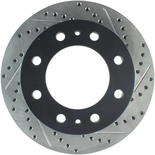 StopTech recognizes that great brakes need to look as good as they perform. Performance wheels and tires are best complemented with StopTech SportStop Cross-Drilled & Slotted rotors.SportStop Drilled & Slotted brake rotors prevent glazing of the pads, add bite and improve wet and dry braking performance.Every SportStop Drilled & Slotted brake rotor is produced from a high quality Centric Parts blank casting and finished in a durable e-coating for corrosion resistance.SportStop Drilled & Slotted rotors look great behind custom wheels, improve the initial bite of the brake pads, and help wipe away the debris that forms between the pad and the disc. A set of SportStop cross-Drilled & Slotted rear replacement rotors is a great way to match the aesthetics of a StopTech Big Brake Kit with the cross-Drilled & Slotted rotor option. *E-Coated Finish*Every SportStop rotor is finished with black e-coating on both sides of the hat, inside the the cooling vanes, and on the outside edge. E-coating is a superior electro-statically applied finish designed to withstand 400 hours of salt water exposure without rusting. This is especially important on both mounting faces of the hat where it touches the hub flange and back face of the wheel. Any accumulation of rust in these area can lead to installed lateral run out issues.*Power Alloy Metallurgy*Power Alloy metallurgy is exclusive feature of SportStop rotors. In specific vehicle applications, StopTech works with foundry partners to increase the molybdenum or carbon content of the castings, and to carefully control the cooling rate during production to reach targets for hardness and tensile strength.*Cooling Vane Design*Nearly all SportStop Cross-Drilled & Slotted rotors have unique Drilled & Slotted hole patterns for the left and right sides of the vehicle. For these directional patterns, straight vane or pillar vane rotors are used to ensure that a Drilled & Slotted hole never touches a cooling vane.