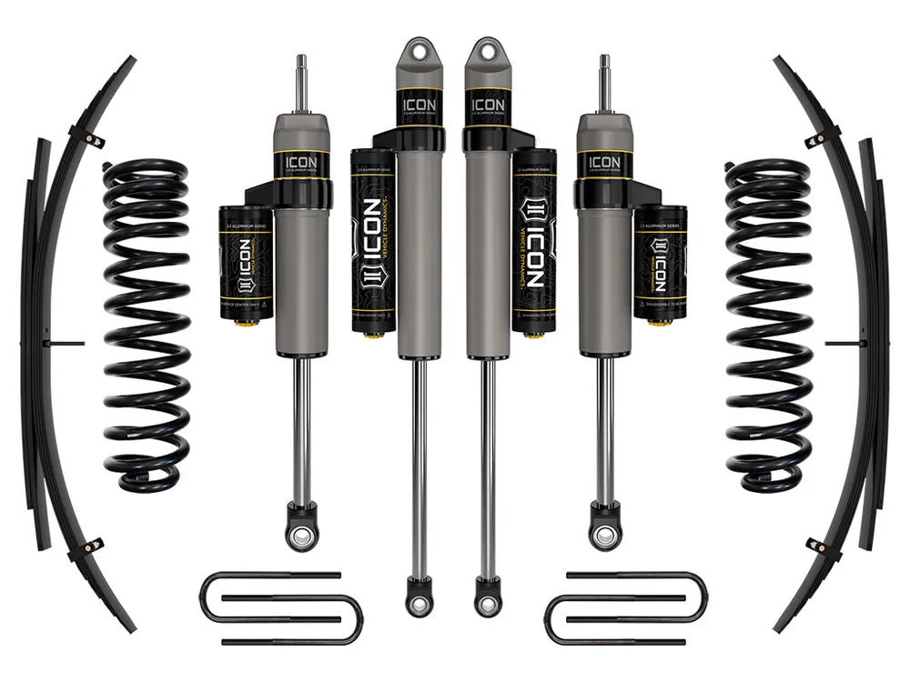 The ICON 2.5” suspension system is a great way to lift your 4WD 2017-2019 Ford F-250/F-350 Super Duty while improving ride quality and performance. This upgraded Stage 2 system is great for towing, rough construction site terrains, and country dirt roads all while keeping a smooth highway feel. ICON’s Stage 2 System is comprised of dual rate coil springs, 2.5 Aluminum Series piggyback reservoir front and rear shocks, alignment cams for adding caster, and rear leaf spring expansion packs with blocks and U-bolts for a more compliant ride and reduced axle wrap. ICON 2.5″ piggyback reservoir shocks ensure optimum performance by increasing the duration of consistent damping regardless of situation, keeping the shocks at a cooler operating temperature during heavy use. With the endless hours ICON has spent testing and tuning our suspension components and shocks as a complete package, you can rest assured you have the best suspension solution on the market.