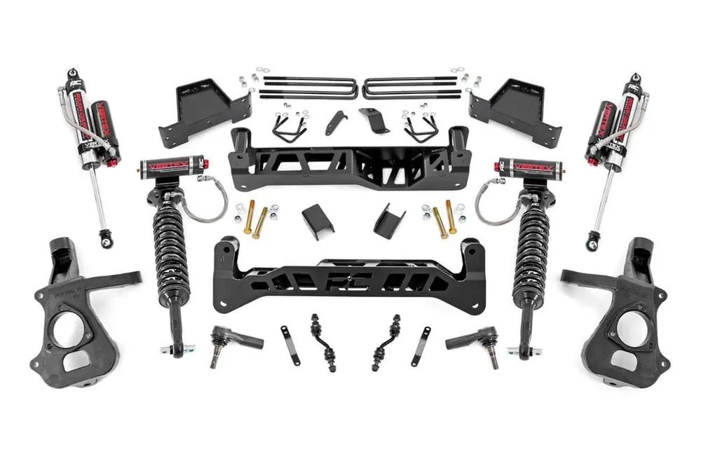 - Front Components Lifted knuckles Front crossmember Rear crossmember Lifted Vertex Reservoir Coil-Overs Sway-bar drop brackets Hardware