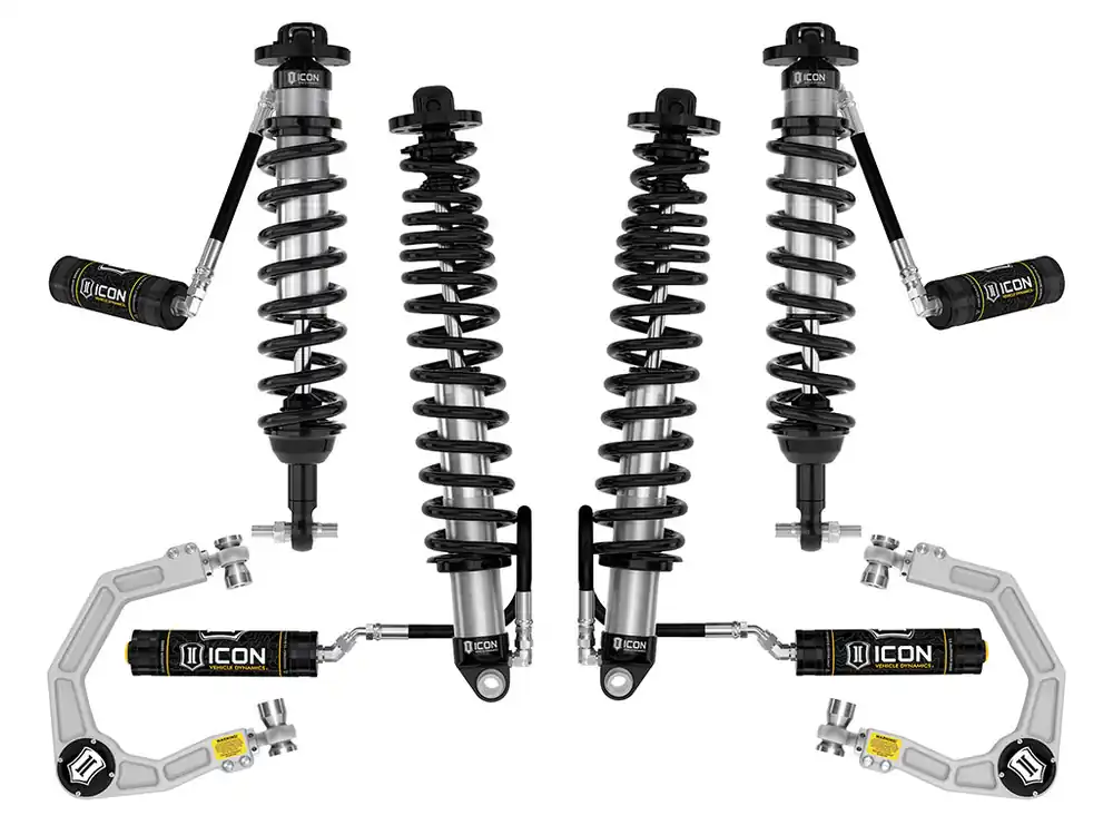 This suspension system is designed to provide up to 11.5″ of front suspension travel and 14″ of rear suspension travel when used with 35X12.50 tires. It may be safely used with 37″ and larger tires if using the optional up-travel limiters (sold separately). The factory crash bars on non-Sasquatch equipped Broncos must be removed to clear 35″ and larger tires, but ICON now offers a replacement High Clearance Crash Bar set for those who would like to run larger tires and retain the functionality of the crash bars.