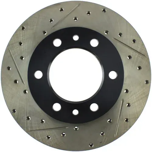 StopTech recognizes that great brakes need to look as good as they perform. Performance wheels and tires are best complemented with StopTech SportStop Cross-Drilled & Slotted rotors.SportStop Drilled & Slotted brake rotors prevent glazing of the pads, add bite and improve wet and dry braking performance.Every SportStop Drilled & Slotted brake rotor is produced from a high quality Centric Parts blank casting and finished in a durable e-coating for corrosion resistance.SportStop Drilled & Slotted rotors look great behind custom wheels, improve the initial bite of the brake pads, and help wipe away the debris that forms between the pad and the disc. A set of SportStop cross-Drilled & Slotted rear replacement rotors is a great way to match the aesthetics of a StopTech Big Brake Kit with the cross-Drilled & Slotted rotor option. *E-Coated Finish*Every SportStop rotor is finished with black e-coating on both sides of the hat, inside the the cooling vanes, and on the outside edge. E-coating is a superior electro-statically applied finish designed to withstand 400 hours of salt water exposure without rusting. This is especially important on both mounting faces of the hat where it touches the hub flange and back face of the wheel. Any accumulation of rust in these area can lead to installed lateral run out issues.*Power Alloy Metallurgy*Power Alloy metallurgy is exclusive feature of SportStop rotors. In specific vehicle applications, StopTech works with foundry partners to increase the molybdenum or carbon content of the castings, and to carefully control the cooling rate during production to reach targets for hardness and tensile strength.*Cooling Vane Design*Nearly all SportStop Cross-Drilled & Slotted rotors have unique Drilled & Slotted hole patterns for the left and right sides of the vehicle. For these directional patterns, straight vane or pillar vane rotors are used to ensure that a Drilled & Slotted hole never touches a cooling vane.