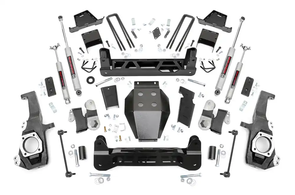 This kit also includes a set of front and rear crossmembers that are laser cut from durable US steel for a precise fit and feature an RC logo that displays prominently at the front of the vehicle. Each kit also features lifted knuckles, a beefy differential skid plate, and a set of Rough Country’s N3 Nitrogen-charged shock absorbers that provide an incredibly smooth, factory-like ride quality both on and off-road.