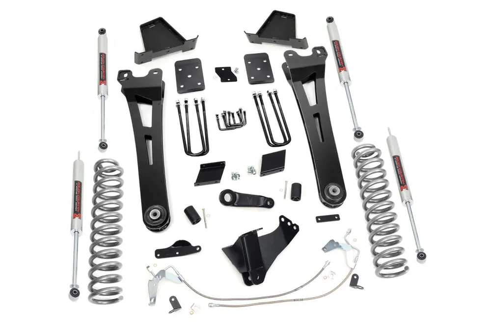 Compliment your 11-14 Ford F-250’s aggressive, good looks with Rough Country’s 6-inch Radius Arm Lift Kit. Rough Country’s 6-inch Lift Kit was engineered to retain the F-250’s impressive factory specs while bumping up performance and durability where it’s needed most. The result is an aggressive, lifted beast with a mean profile and balanced on and off-road ride quality.When changing a vehicle’s suspension, the key to preserving ride quality is in keeping the geometry of all suspension components as close to their factory angles as possible. Rough Country’s new 6-inch Radius Arm Suspension Lift features a set of ultra-durable Radius Arms, precision fit to bolt right into the factory mounts for an easier install and a more factory-like angle. At 27lbs each, these beefy, upgraded Radius Arms dwarf stock equipment while and feature durable durable rubber bushings for maximum vibration absorption.This all-inclusive kit also features an adjustable alignment cam at the axle to allow caster adjustment as well as a track bar relocation bracket and a drop pitman arm. A full set of N2.0 Shocks provide a truly balanced ride quality for on and off-road use – perfect for daily drivers. This kit also ships with a set of durable, lifted coil springs and brake line relocation brackets.This innovative kit design features a 100% bolt-on installation process that is lightning fast compared to other kits this size. Save time and money with no need for cutting, drilling, or other complicated procedures. Rough Country’s 6-inch Radius Arm Lift Kit is backed by our Lifetime Replacement Warranty.